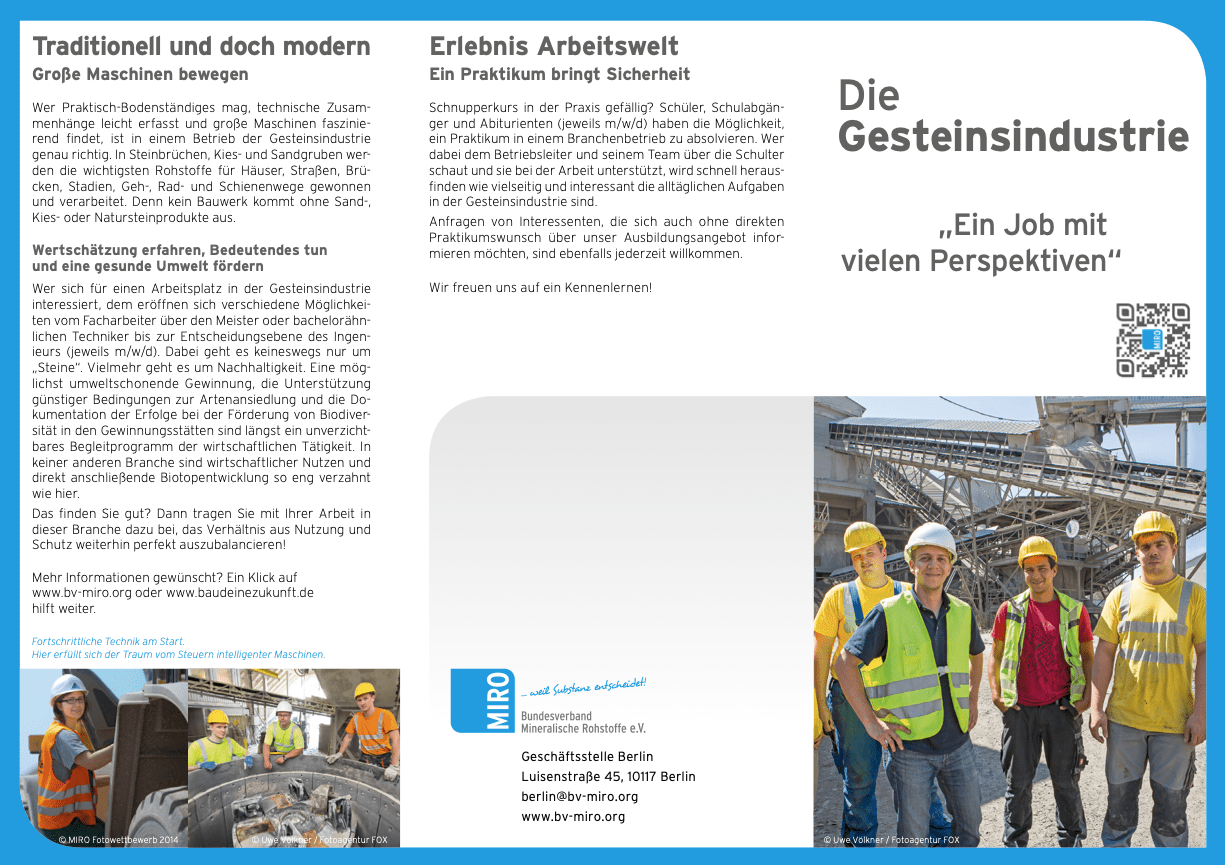Ohne Sand-, Kies-, Quarz- und Natursteinprodukte kann nichts gebaut werden. In Steinbrüchen, Kies- und Sandgruben werden die wichtigsten Rohstoffe für Häuser, Straßen, Brücken, Stadien, Geh-, Rad- und Schienenwege gewonnen und verarbeitet. Kein Bauwerk kommt ohne Sand-, Kies- oder Natursteinprodukte aus. Auch zahlreiche weitere Branchen sind auf Gesteinsrohstoffe angewiesen. Dies sowie viele weitere Gründe – wie auch die Natur- und Artenschutzprojekte in den Betrieben – machen die Arbeit in der Gesteinsindustrie zu einer sinnstiftenden Aufgabe. Eine Karriere in der Gesteinsindustrie bietet Wertschätzung, Anerkennung und die Gelegenheit, zu einer gesunden Umwelt beizutragen.